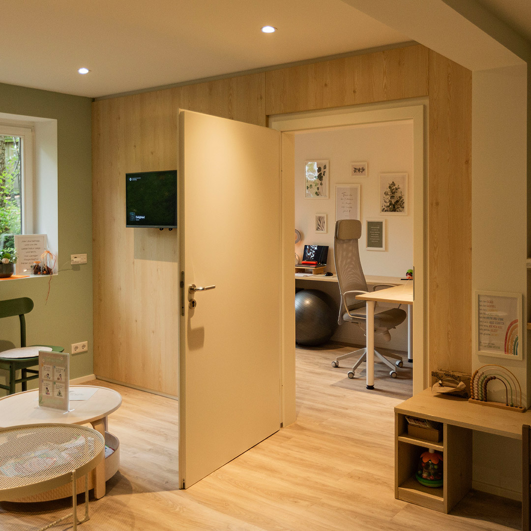 Für die Logopädiepraxis von Melissa Hoxter in Erlangen durften wir richtig viel Praxisgefühl aus Holz bauen: ein maßgefertigtes Klettergerüst mit Hängesitz für Bewegung, Gleichgewicht und spielerisches Training plus Empfangstheke, Behandlungszimmer mit Schreibtisch sowie passende Schränke und Regale.