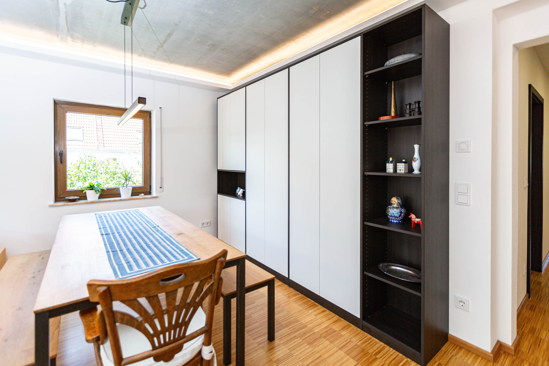 Alles sitzt wie angegossen. Einbauschränke schmiegen sich perfekt in die freie Nische unter der Treppe oder der Dachschräge. Die Eckbank hat die optimale Länge und bietet für alle Personen ausreichend Sitzfläche. Die im Flur integrierte Garderobe sorgt für reichlich Stauraum und Ordnung unter den Jacken. Nicht nur, dass es einfach großartig aussieht, wenn die Einrichtung perfekt in die vorhandenen Räume passt; ungenutzte Flächen oder knifflige Raumsituationen werden außerdem effektiv genutzt. Das bringt zusätzlichen, wertvollen Stauraum in Ihre Wohnung, sorgt für Übersicht und schafft Platz zum Durchatmen.